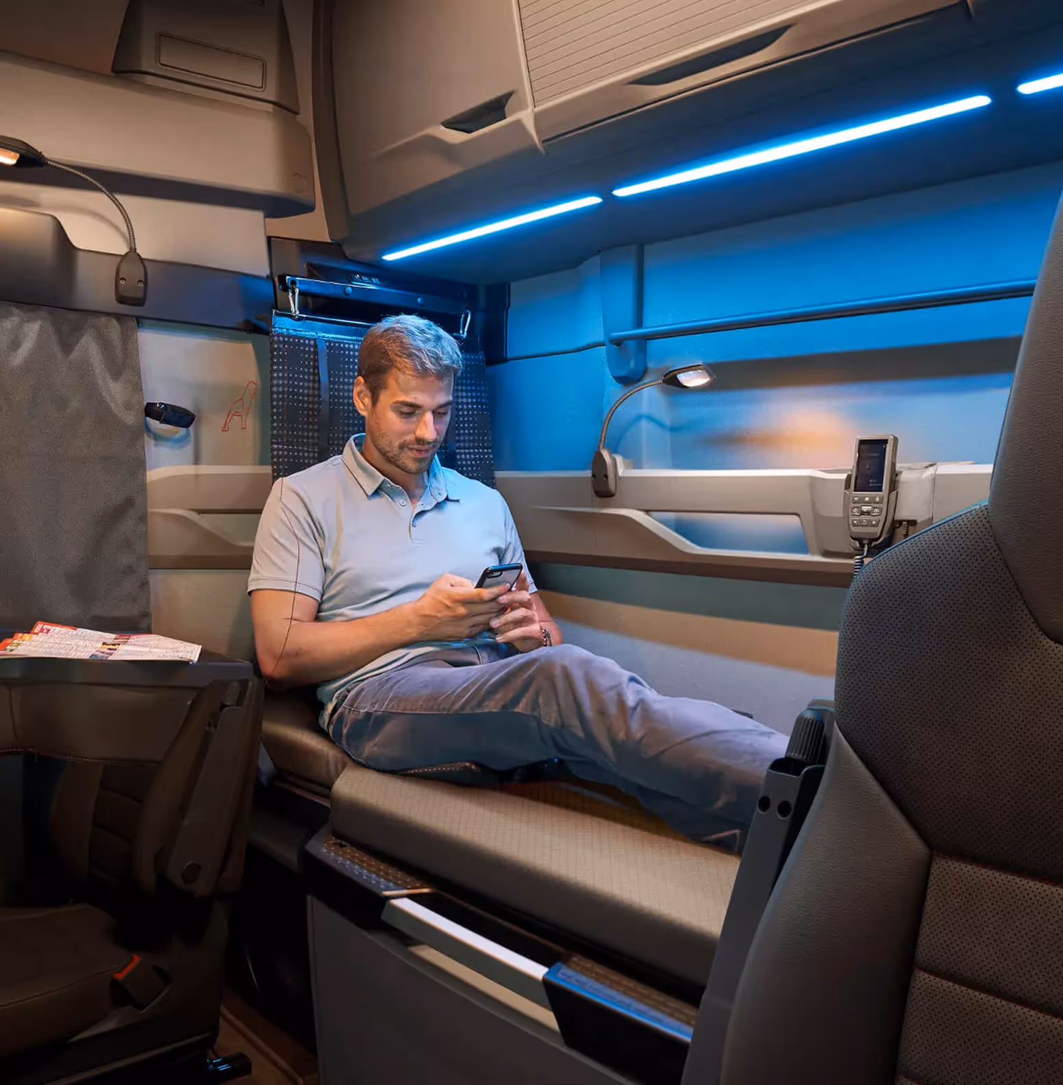 TGX är designad med en ergonomisk och intuitiv cockpit, med premiumstolar och en multifunktionsratt. Den bekväma hytten, komplett med ett rymligt vilo- och sovutrymme, gör TGX till ett sant hem på vägen.